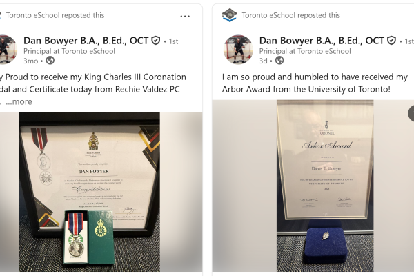 Hello, my name is Dan Bowyer and I am the Principal of Toronto eLearning School. This past year has been a ‘trifecta’ of accomplishments for me personally. Back in May of 2025 at the University of Toronto’s Defy Gravity Volunteer Summit, I and others were presented with our Defy Gravity pin in recognition of our support towards reaching the 2021 Defy Gravity campaign goal of $4 billion. Currently we are more than half way there. Also in May 2025, I…
